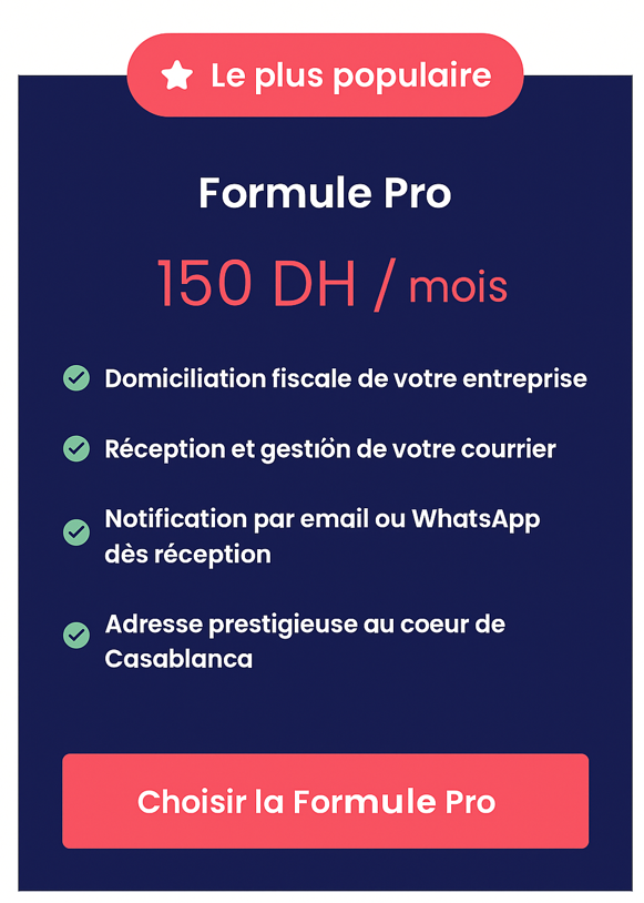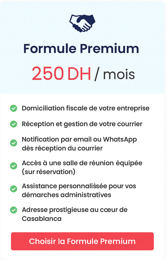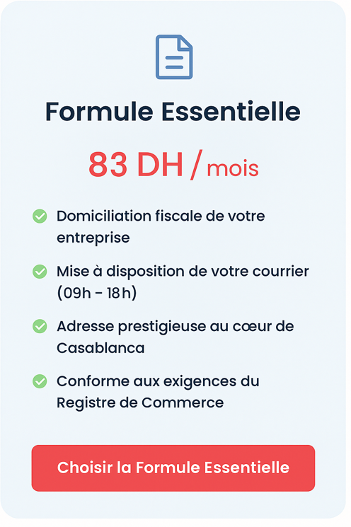 Nos formules commencent à 83 DH/mois, avec attestation immédiate et adresse prestigieuse à Casablanca